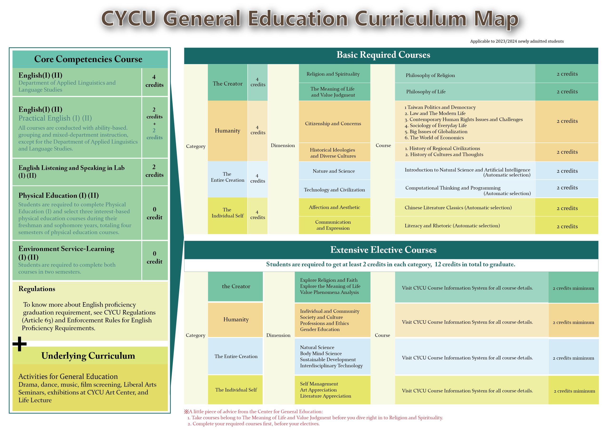 The curriculum is separated into four areas: the Creator, Humanity, the Entire Creation, and the Individual Self. More than 130 courses comprising more than 300 classes are regularly held each semester. To qualify for graduation, students are required to complete 34 credits from the Center. In every category, students must have two to four course credits in the required courses and take at least two extended, elective courses from courses in each area.